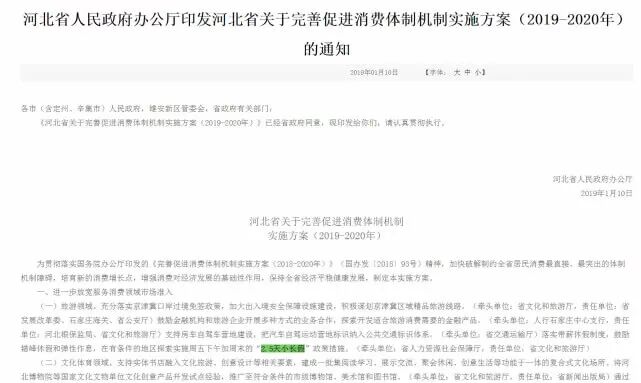 2019年1月,据河北省政府网站消息,河北省印发《河北省关于完善促进消费体制机制实施方案(2019-2020年)》(简称《方案》)。《方案》提出,落实带薪休假制度,鼓励错峰休假和弹性作息,在有条件的地区探索实施周五下午加周末的“2.5天小长假”政策措施。
