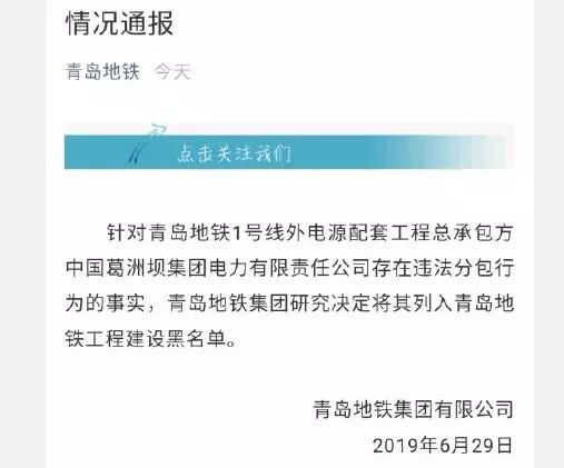 青岛地铁微信公众号28日晚间及29日两次发布消息称,日前,针对有举报人对青岛地铁1号线外电源配套工程的举报,青岛地铁专项调查工作组持续开展调查工作。根据目前调查情况,发现该项目总承包方中国葛洲坝集团电力有限责任公司涉嫌违法分包行为。青岛地铁集团研究决定将其列入青岛地铁工程建设黑名单。