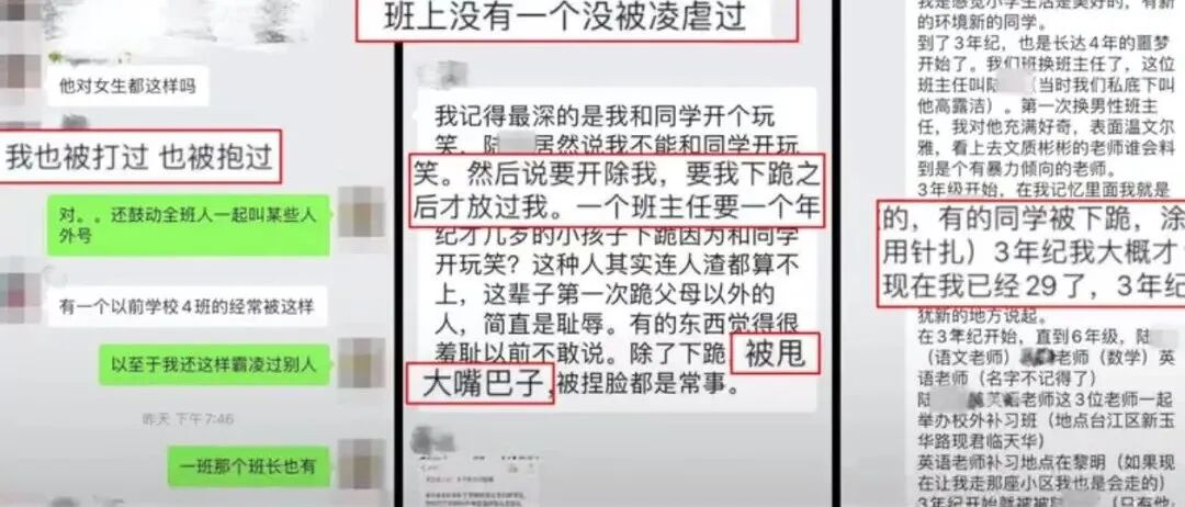 微信群聊天截图显示,多名同学自称被老师打耳光、图钉扎身体、下跪处罚。有女生表示老师曾直接坐在腿上,或是搂抱的行为。