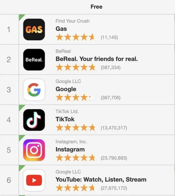 在这段TikTok视频发出的前一天(10月12日),连续坐镇美国总榜第一的应用BeReal被这款名叫“Gas”的匿名社交产品挤下了Top1的王座。“投之以桃,报之以李”,这款匿名社交的善意玩法既可以让用户为其他人送去赞美,也能收获意想不到的夸赞。谁不喜欢被赞美呢?