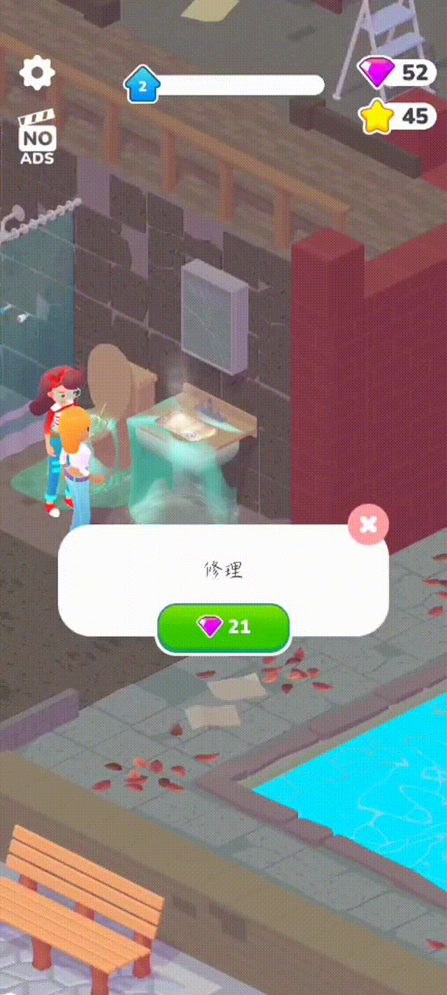 初玩确实能够给玩家带来极强的沉浸感与爽感,但重复几个来回,难免会感到疲惫。而最令人惊喜的就是,《Decor Life》的开发者似乎也考虑到了这一点,因此在任务关卡之外融入了文字剧情、别墅装修、宠物与收集藏品等多种元素,在每个关卡完成后,玩家会拥有两次抽取藏品的机会(一次免费,一次看广告),同时也会获得星星与钻石:星星用于解锁别墅中需要重新装修的场景,然后通过花费钻石来选择想要的家具样式,抽取的藏品则可以按照玩家喜好摆放在别墅中的任何位置,从而打造出带有自己风格的家园。