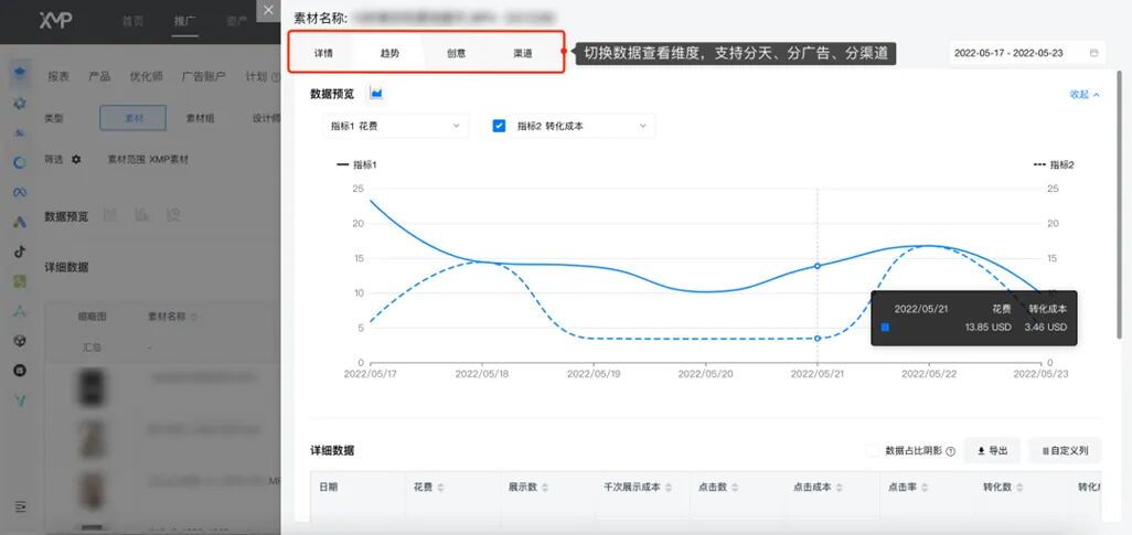 因此,哇哇鱼团队研究了所有主流广告平台的具体要求,确保其产出的素材内容可以支持多个渠道适配,以最大化地提高素材的使用效率。XMP可为企业提供专属素材库,设计师上传素材,投手能直接在企业素材库中选择素材并且创建广告投放,还能多渠道使用。同时,设计师能在 XMP 随时查看素材的数据,包括自动评分、 ROAS、留存、LTV 等数据。同时后台呈现各种可视化效果,支持表格、趋势图、柱状图、饼图等,能直观分析素材表现。