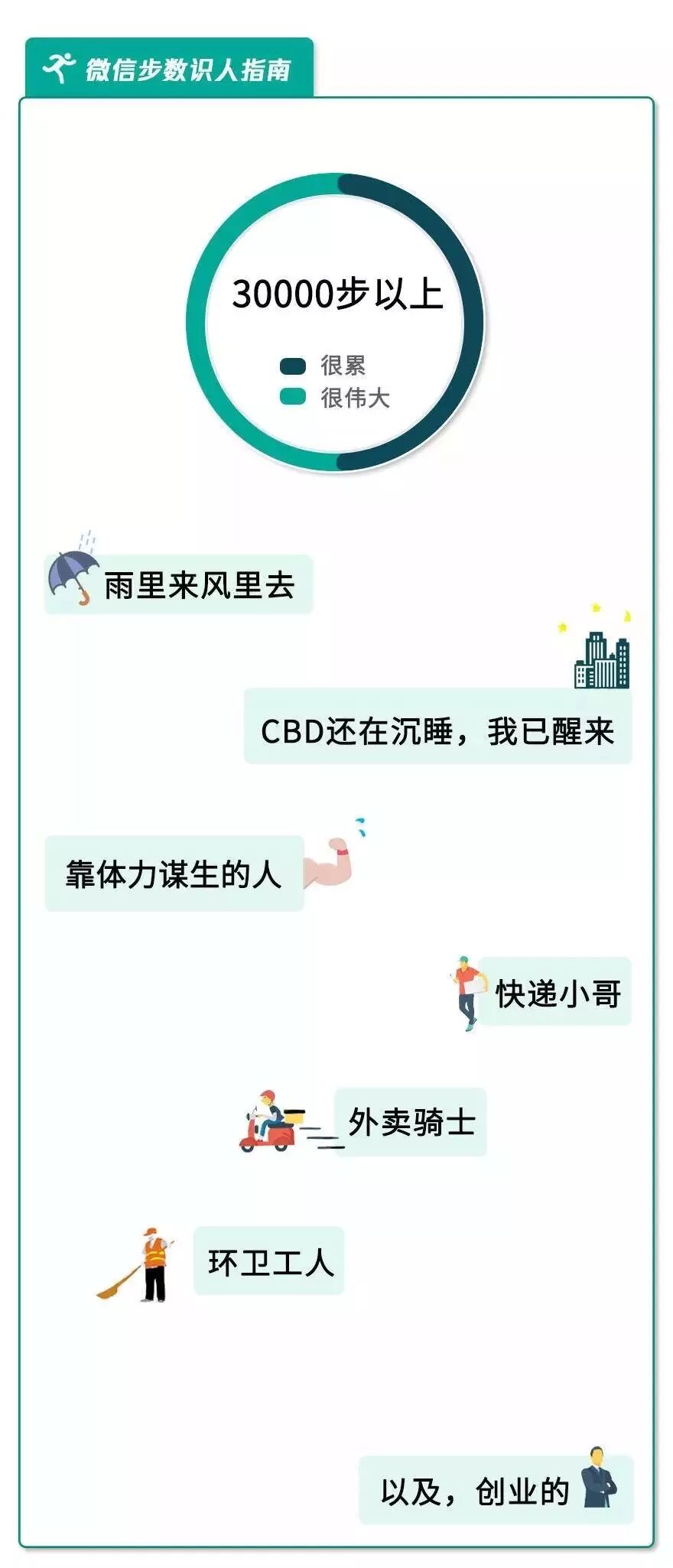 微信官方账号“WeChat moments”还曾出过“微信运动步数识人指南”,来看看你在第几档?
