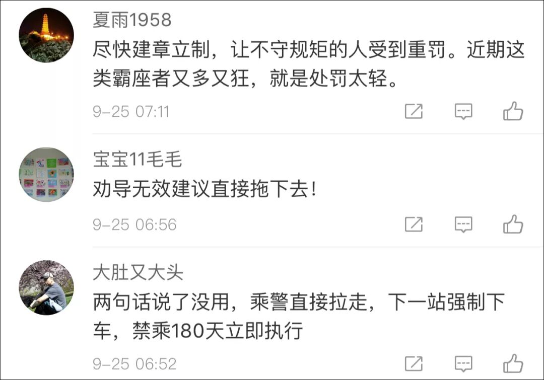 对此,不少网友讨论,“霸座”事件频发,是否因为处罚力度不够大?