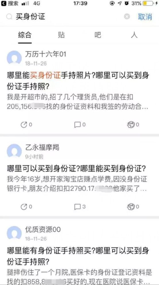 “买个身份证!85年以下不要,男的”,11月13日,某用户在百度“三和大神吧”发帖求购身份证,当日,就有多名卖家在评论中留下联系方式,其中一位声称“来珠海,50卖你,好几张,随你挑”。