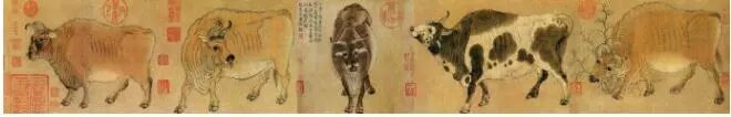 《五牛图》是韩滉作品的传世孤本,也是为数寥寥的几件唐代纸质绘画真迹之一,还是中国美术史上现存最早的纸本绘画真迹。入宋以后,它一直被珍藏在皇宫内苑之中。