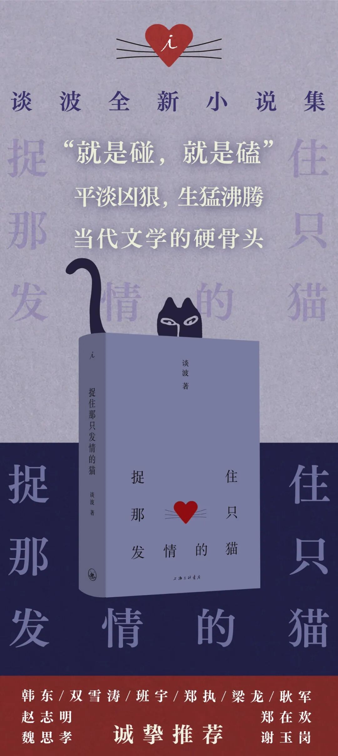 谈波:我有一个朋友里尼,他也是非常喜欢这本书的装帧设计。他打了个比方,他说像一只“装满了易燃物的紫色火柴盒”。我当时也感觉眼前一亮。正好里面有十二篇小说,就像十二根火柴一样。我在做每根“火柴”的时候,配料尽量做得不一样,有的温柔、温暖,有的灼热猛烈一点。杨大壹:这本书里有十二篇小说,最后一篇同名小说《捉住那只发情的猫》(以下简称《捉猫》)是小中篇,前面几篇都是短篇。每一篇的方向都不太一样,有80年代写的,也有今年上半年快速写出来的。当时为什么把这十二篇谋篇布局放在这本书里面?写得最早的是哪篇?谈波:写得最早的,我不想说,为什么?因为有好多读者看的时候并不知道那几篇竟然写得那么早,这是我挺开心的地方。最早的已经将近三十年了,也可能三十多年,但是现在仍然有人觉得还行,也没过时,这点我感觉到挺开心的。我先从同名的《捉猫》说起,我一开始写的时候想把它当作一个长篇来写,在这之前我也没写过长篇,人也处于懒惰和业余状态,我就跟我尊重的,我认为是一个时代的巨人,韩东老师,跟他做了交流,我把我的想法都和他说了,他在电话里鼓励我,他在电话里的声音我现在还能记起来,他说得非常果断,好像这个事真是那么回事似的。他说:“老谈你没有问题。”我当时一股热血上头,感觉我好像真没有问题。谈波:然后我用十个月时间把这篇写完了,当时我自己打70分,我认为也不过如此,这是七年前的事。写完以后这本书就放下了,第一本小说集就出了,这是六年前。今年1月1日,我又认识两个年轻的朋友,我们见面互相聊得特别好,因为我在大连比较闭塞一点,比较孤单一点,我很少遇到这么爱好文学、喜欢小说、能谈得来的朋友在一块聊,有时候认识可能也不经常见面。我们那天聊的,我说哪点,他俩都能理解,他俩说哪点,我也能笑出来,感觉特别特别好。![]()