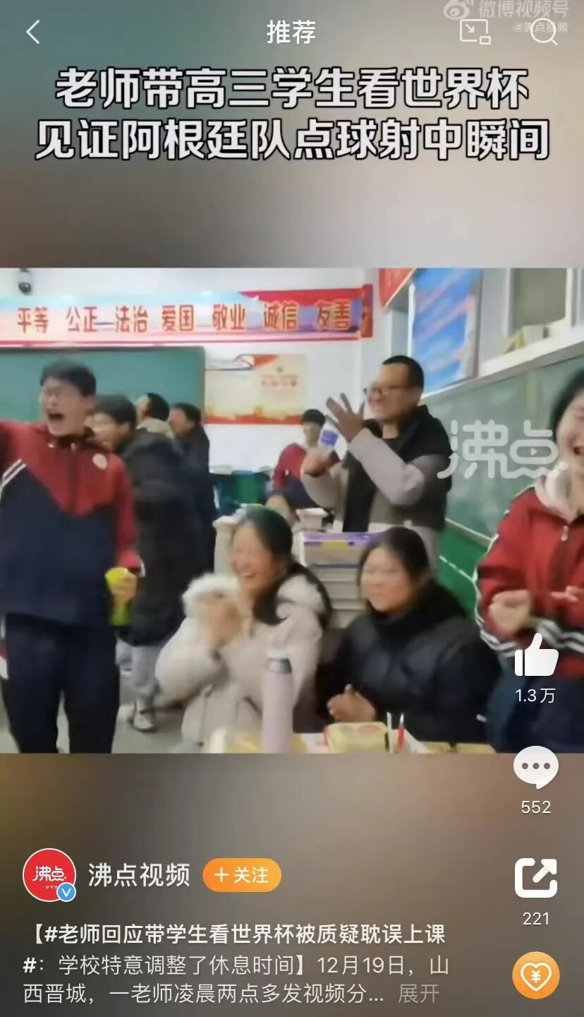虽然热搜题为“#老师凌晨组织学生教室看世界杯引质疑#”,但新闻的评论区中,还是支持老师做法的声音居多。“青春的模样!”“孩子们得到了一次非常珍贵的体验课!”的确,学生们的雀跃和呐喊,是对质疑最好的消解。这样的课堂插曲,对于高三的学子们来说,是一种难得的放松,也是一次宝贵的教育。