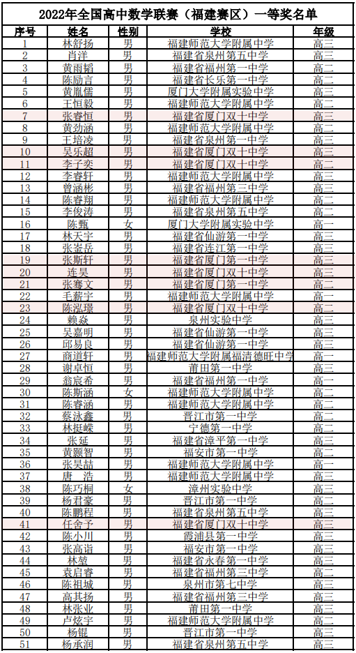 福建省一等奖获奖名单