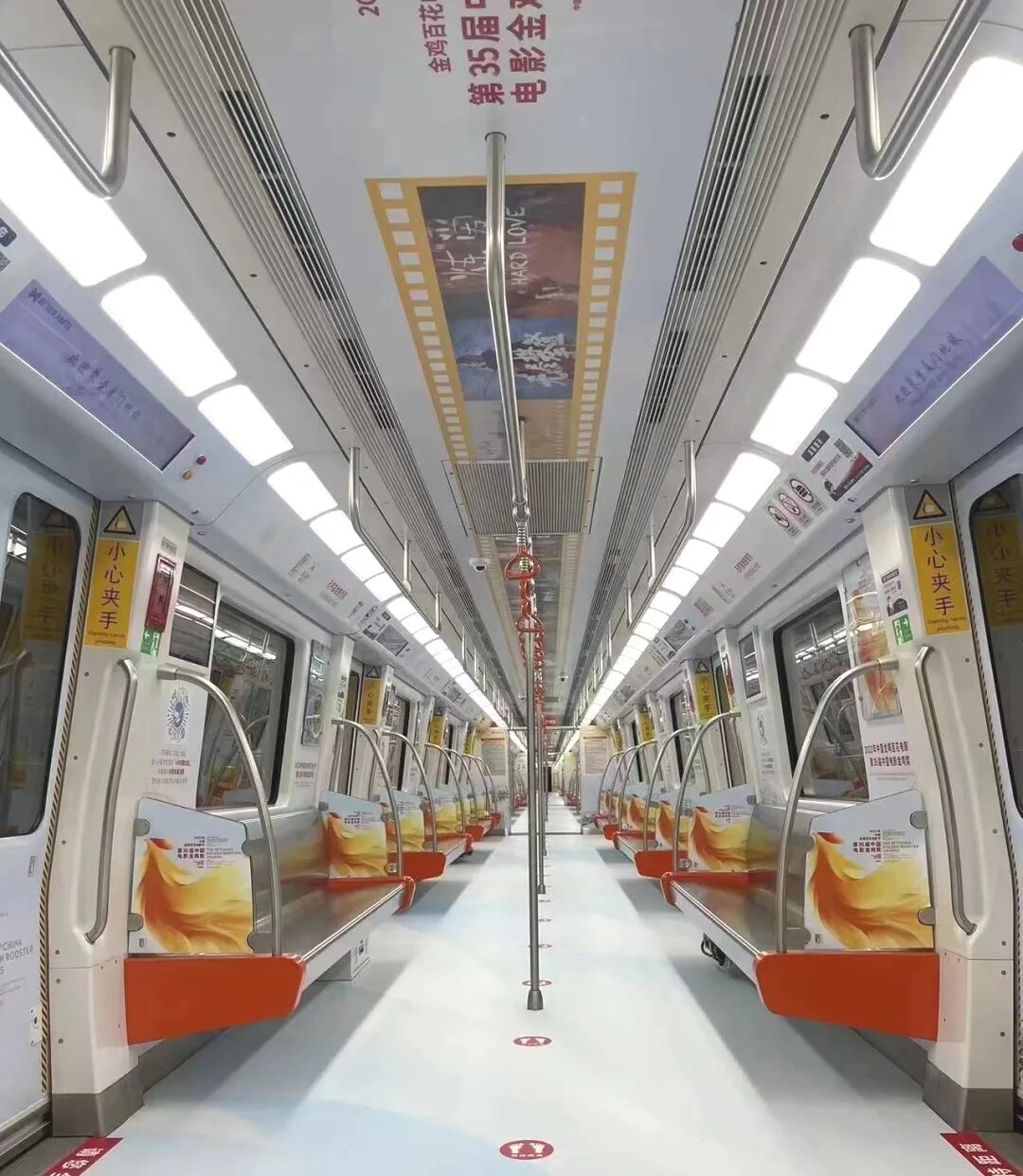 海天一色的浅蓝在车厢内泛起微漾,金鸡电影节标志性的金鸡点缀其间,脚下是透明的海水,抬头是胶卷里的华语光影,眼之所见是厦门地铁TOD的未来规划,心之所往是元宇宙时代的赛博鹭岛。