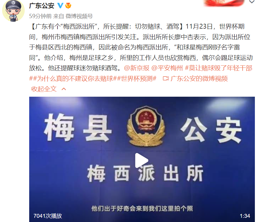 11月23日,世界杯期间,梅州市梅西镇梅西派出所与球星梅西刚好名字雷同引发关注。派出所所长廖中杏表示,因为派出所位于梅县区西北的梅西镇,因此被命名为梅西派出所,梅州是足球之乡,所里的工作人员也欣赏梅西,偶尔会踢足球运动放松。他还提醒球迷勿赌球酒驾。