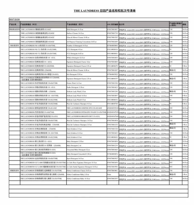 召回信息提及,对于提供从THE LAUNDRESS中国官方渠道购买相关批次产品的凭证并寄回产品的消费者,经确认后可选择换货(获得官方旗舰店2倍积分,有效期1年,可兑换同规格产品2瓶)或按照实付金额退款。