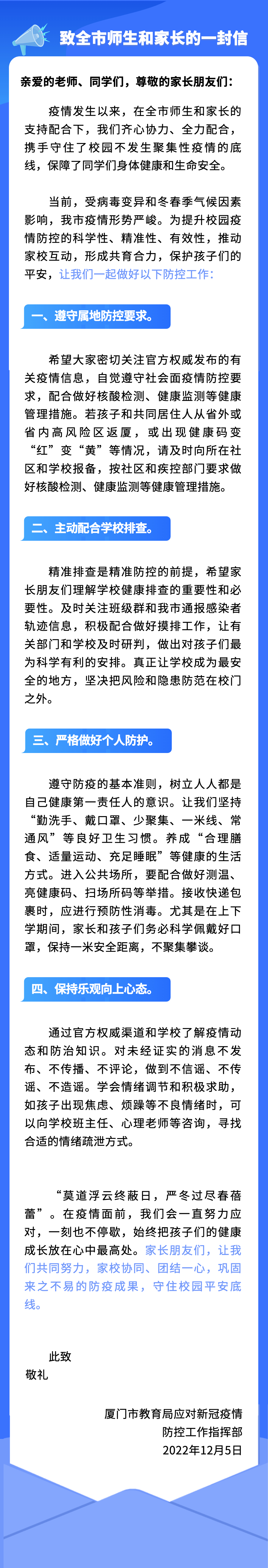 厦门市教育局刚刚发布!致全市师生和家长的一封信