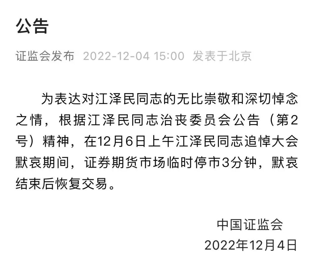 证监会公告称,为表达对江泽民同志的无比崇敬和深切悼念之情,根据江泽民同志治丧委员会公告(第2号)精神,在12月6日上午江泽民同志追悼大会默哀期间,证券期货市场临时停市3分钟,默哀结束后恢复交易。