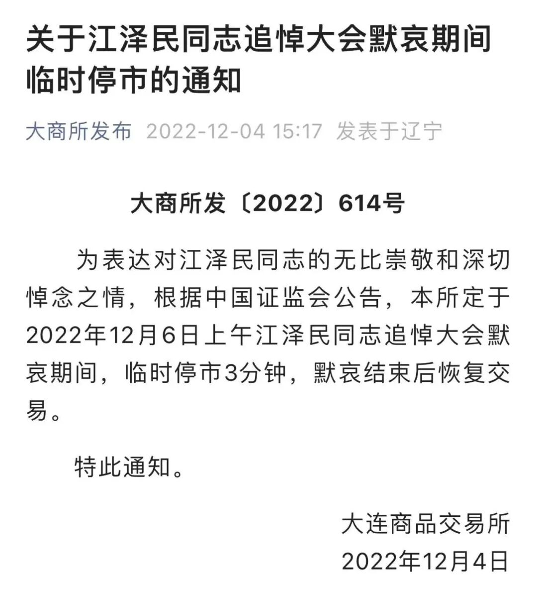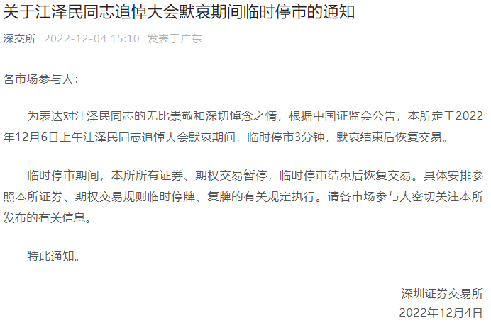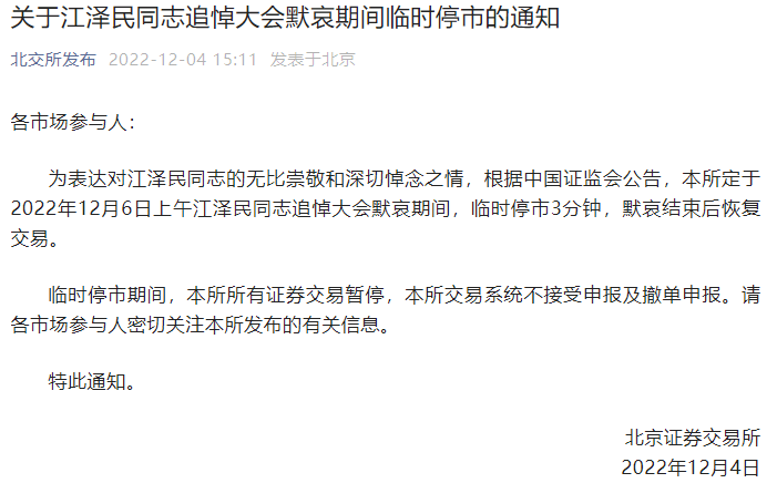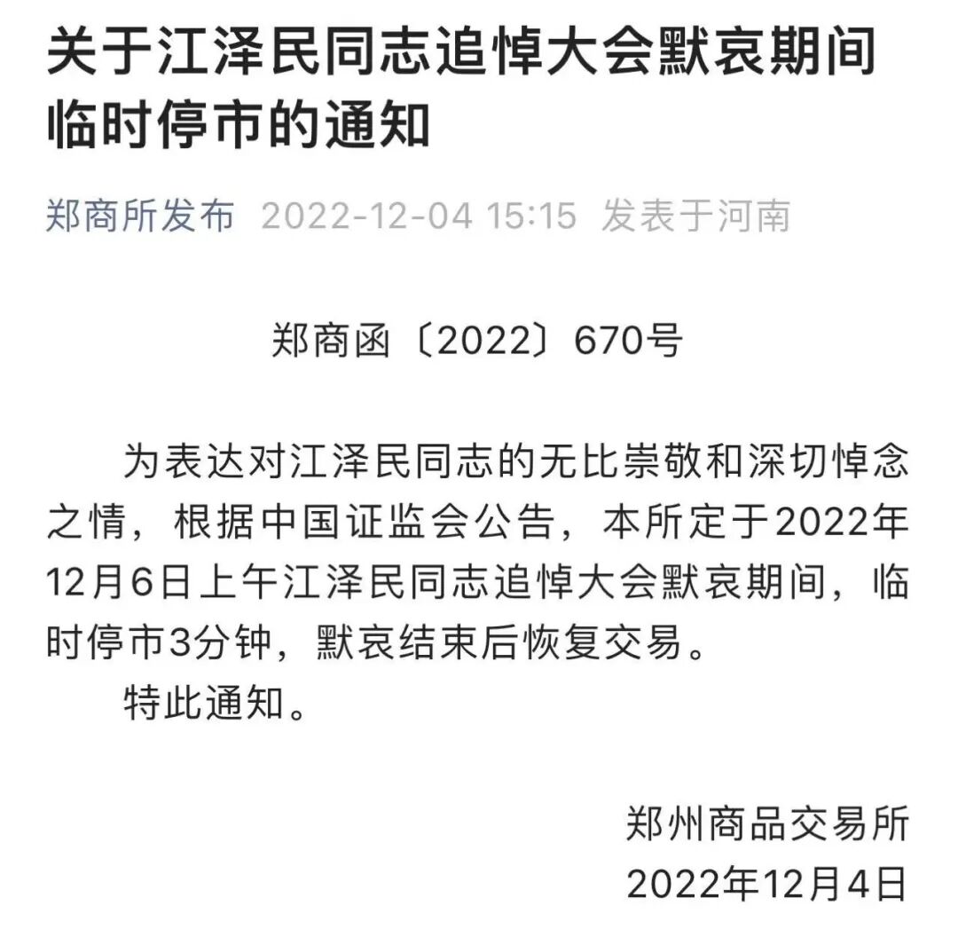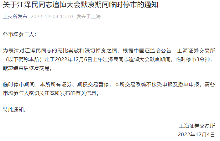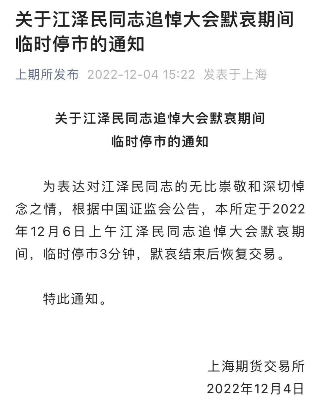 当日,上交所、深交所、北交所、全国股转公司、上期所及上期能源、郑商所、大商所、中金所等纷纷发布通知,定于2022年12月6日上午江泽民同志追悼大会默哀期间,临时停市3分钟,默哀结束后恢复交易。