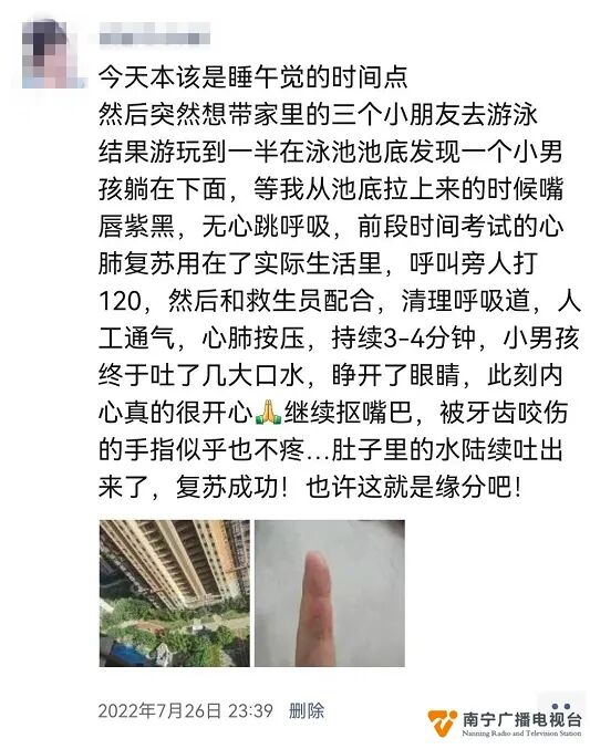 身为南宁市第八人民医院护师的黎雁马上和救生员配合,清理呼吸道,并对孩子进行心肺复苏。