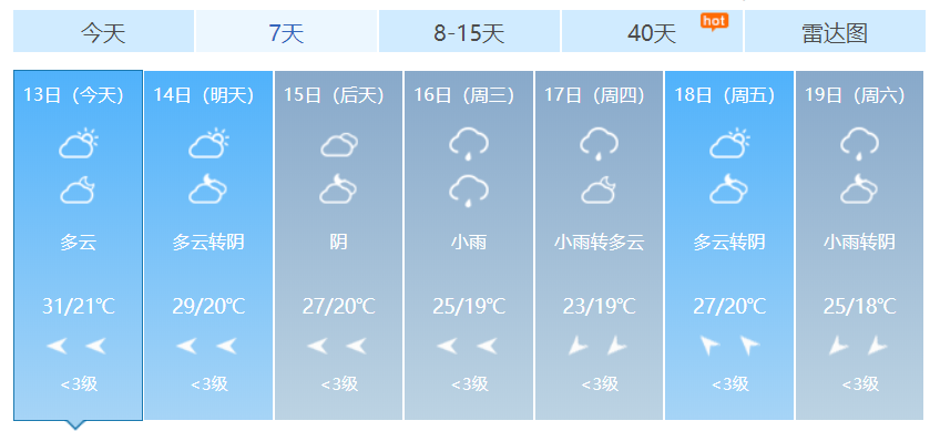 南宁市气象台预计,13日白天,南宁城区多云间晴,南转东风1~2级,最低气温21℃,最高气温31℃。