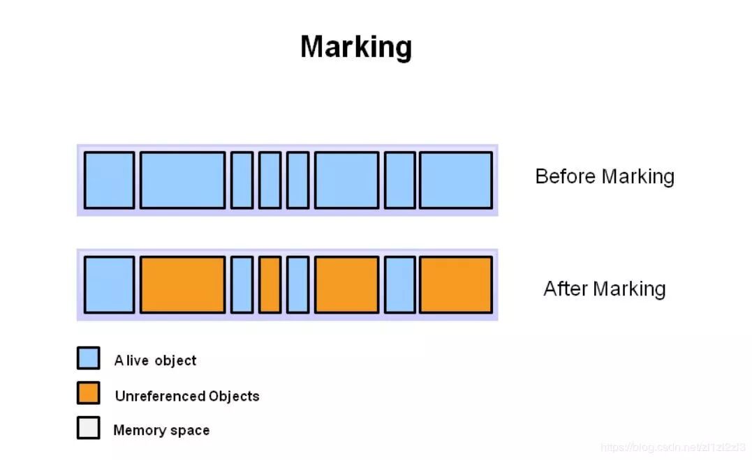 上图中,蓝色表示已引用对象,橙色表示未引用对象。垃圾回收器要检查完所有的对象,才能知道哪些有被引用,哪些没。如果系统里所有的对象都要检查,那这一步可能会相当耗时间。关注Java技术栈微信公众号,回复:JVM46,可以获取一份超全 JVM 调优攻略。