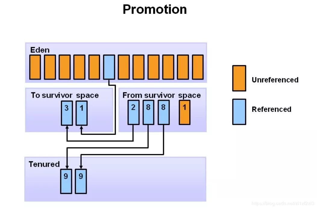 此幻灯片演示了 promotion。在较小的GC之后,当老化的物体达到一定的年龄阈值(在该示例中为8)时,它们从年轻一代晋升到老一代。