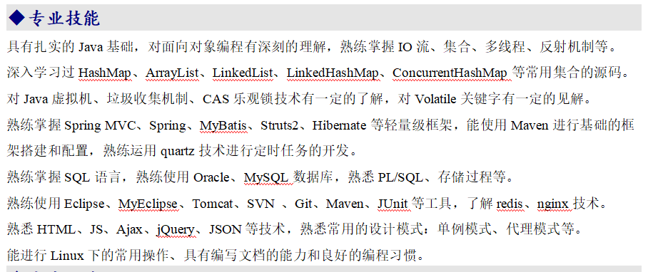 很重要的一点,看题要带着理解、带着思考去看,将题目与实际开发的内容结合去理解,这样很容易就记下来了,死记硬背效果不好。还有看面试题不能只看一次,需要反复看,就像你高中准备考试那样。看完这些面试题后,我能很自信的在我简历写上了: