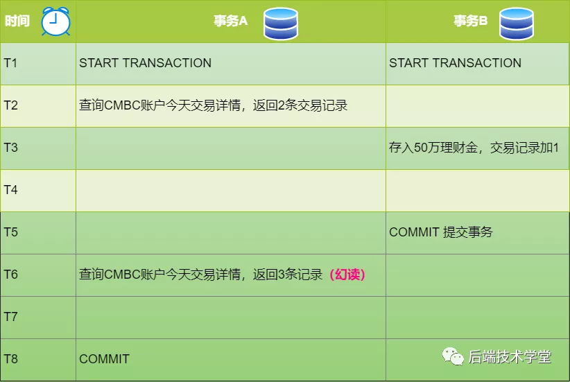 不可重复读的重点是修改:在同一事务中,同样的条件,第一次读的数据和第二次读的「数据不一样」(因为中间有其他事务提交了修改);