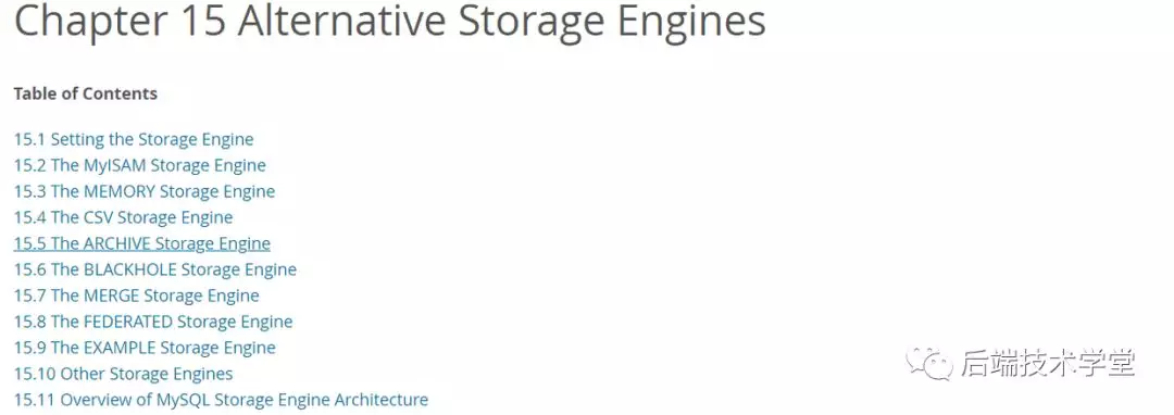 MySQL 还支持其他一些存储引擎,比如 memory 引擎、NDB 集群引擎、CSV 引擎,由于这些引擎没有上述 InnoDB 和MyISAM 常用,这里不作介绍,感兴趣可以去翻MySQL文档了解。这里同样给出官方链接:dev.mysql.com/doc/refman/5.7/en/storage-engines.html