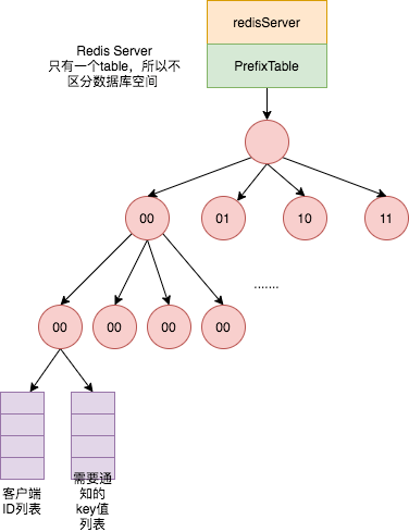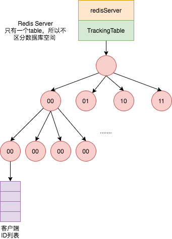 我们也先讲解普通模式的原理,Redis 服务端使用 TrackingTable 存储普通模式的客户端数据,它的数据类型是基数树(radix tree)。