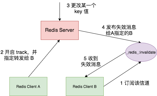 上述操作时客户端都需要先开启 RESP3,Redis 为了兼容 RESP2 协议提供了转发(Redirect)模式,不再使用 RESP3 原生支持 PUSH 消息,而是将消息通过 Pub/Sub 通知给另外一个客户端,具体流程如下图所示。