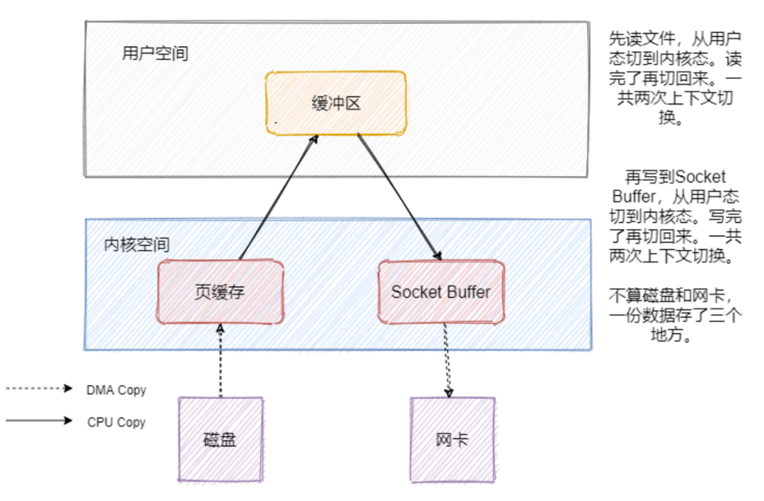 从上面可知访问磁盘文件会将数据加载到页缓存中,但是页缓存属于内核空间,用户空间访问不了,因此数据还需要拷贝到用户空间缓冲区。
