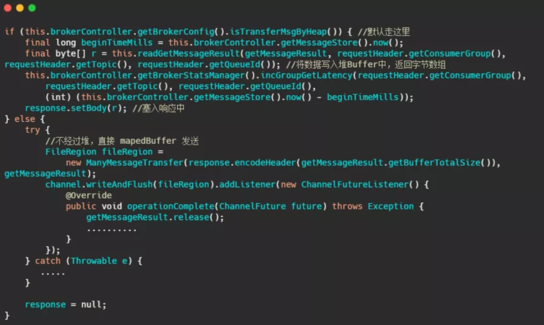 可以看到 RocketMQ 默认把消息拷贝到堆内 Buffer 中,再塞到响应体里面发送。但是可以通过参数配置不经过堆,不过也并没有用到真正的零拷贝,而是通过 mapedBuffer 发送到 SocketBuffer 。
