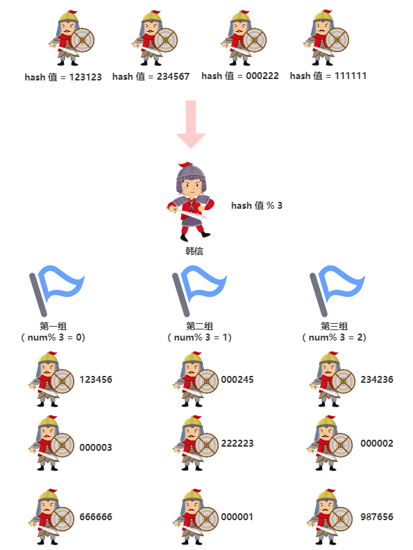 如下图所示,每来一个士兵都有一个六位的 hash 值(也可以称作编号),然后被韩信用除以 3 取余数的方式分配到三个组。比如第一组中的编号为 123456 的士兵,除以 3 之后,整除,余数为 0,所以分配到第一组。