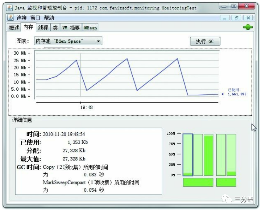 JConsole(Java Monitoring and Management Console)是一款基于JMX(Java Manage-ment Extensions)的可视化监视、管理工具。它的主要功能是通过JMX的MBean(Managed Bean)对系统进 行信息收集和参数动态调整。