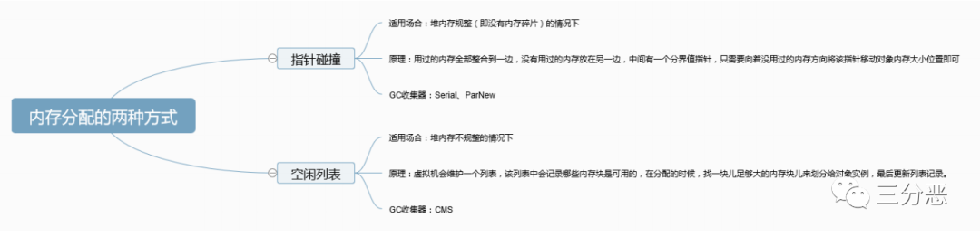 内存分配的两种⽅式:选择以上两种⽅式中的哪⼀种,取决于 Java 堆内存是否规整。⽽ Java 堆内存是否规整,取决于 GC收集器的算法是"标记-清除",还是"标记-整理"(也称作"标记-压缩"),值得注意的是,复制算法内存也是规整的。