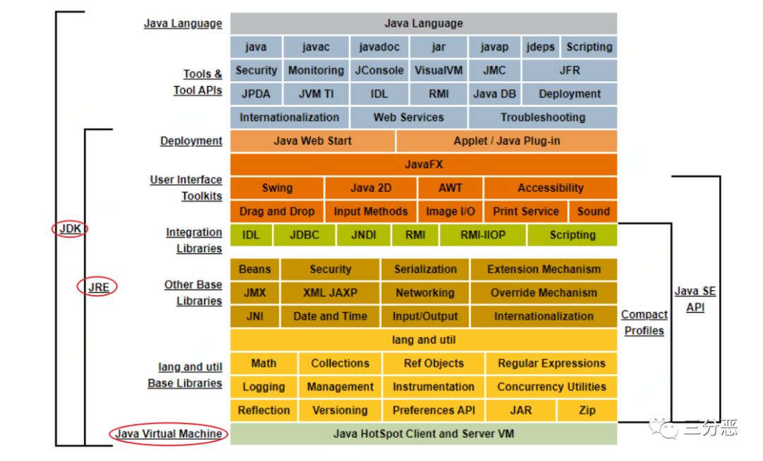 JRE(Java Runtime Environment Java 运行环境) 是 JDK 的子集,也就是包括 JRE 所有内容,以及开发应用程序所需的编译器和调试器等工具。JRE 提供了库、Java 虚拟机(JVM)和其他组件,用于运行 Java 编程语言、小程序、应用程序。