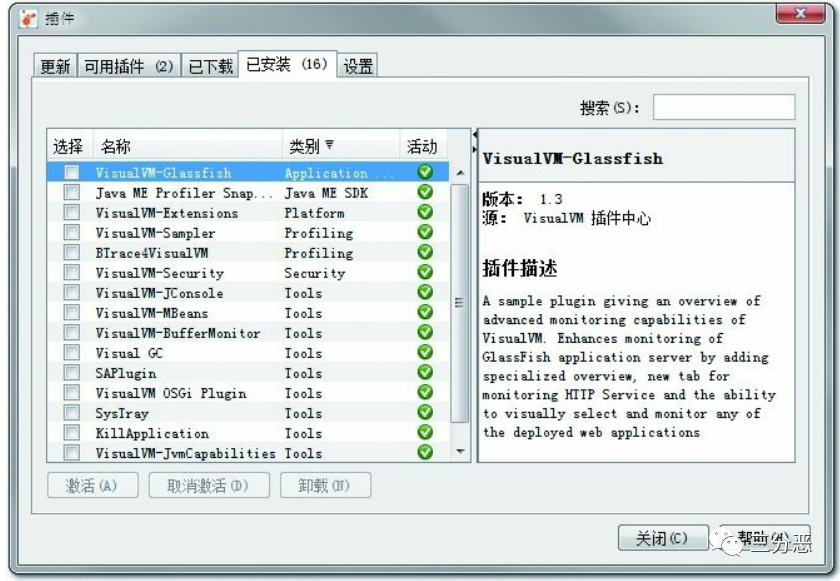 VisualVM的插件可以手工进行安装,在网站上下载nbm包后,点击“工具->插件->已下载”菜单,然后在弹出对话框中指定nbm包路径便可完成安装。