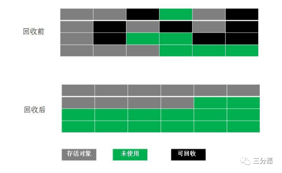 第二个是内存空间的碎片化问题,标记、清除之后会产生大量不连续的内存碎片,空间碎片太多可能会导致当以后在程序运行过程中需要分配较大对象时无法找到足够的连续内存而不得不提前触发另一次垃圾收集动作。