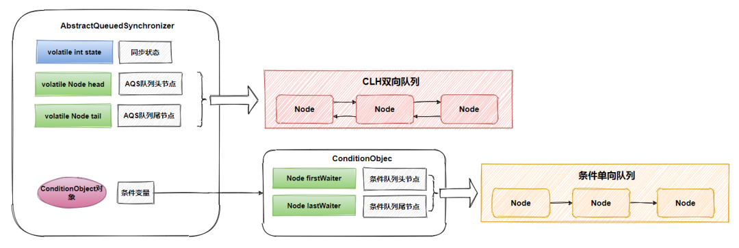 AQS 由三部分组成:state 同步状态、Node 组成的 CLH 队列、ConditionObject 条件变量(包含 Node 组成的条件单向队列),下面会分别对这三部分做介绍。