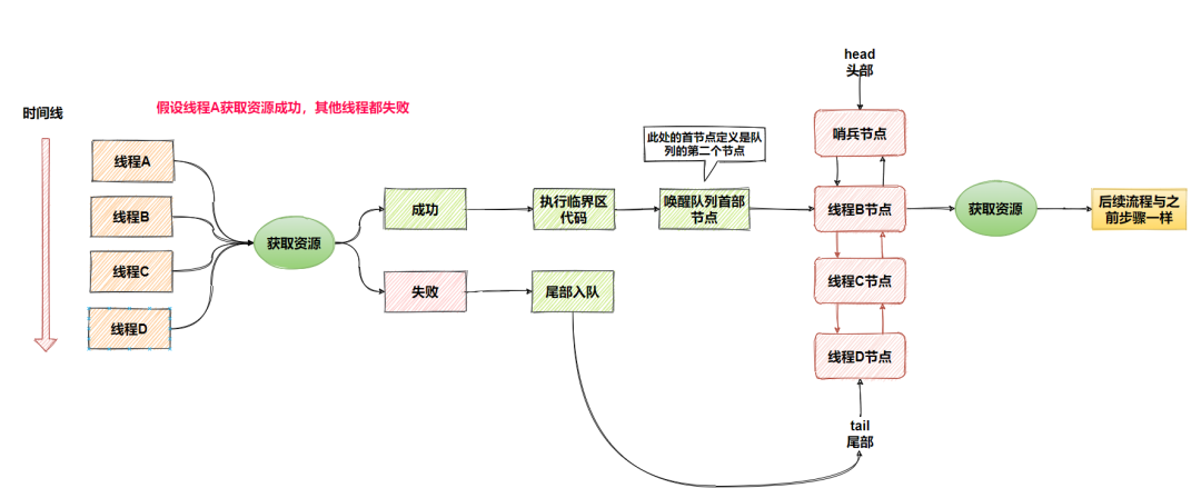 线程获取资源失败,封装成 Node 节点从 CLH 队列尾部入队并阻塞线程。某线程释放资源时会把 CLH 队列首部 Node 节点关联的线程唤醒(此处的首部是指第二个节点,后面会细说)再次获取资源。