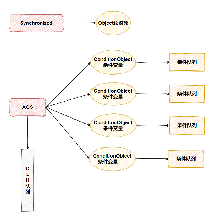不同于 Synchronized 锁,一个 AQS 可以对应多个条件变量,而Synchronized只有一个。