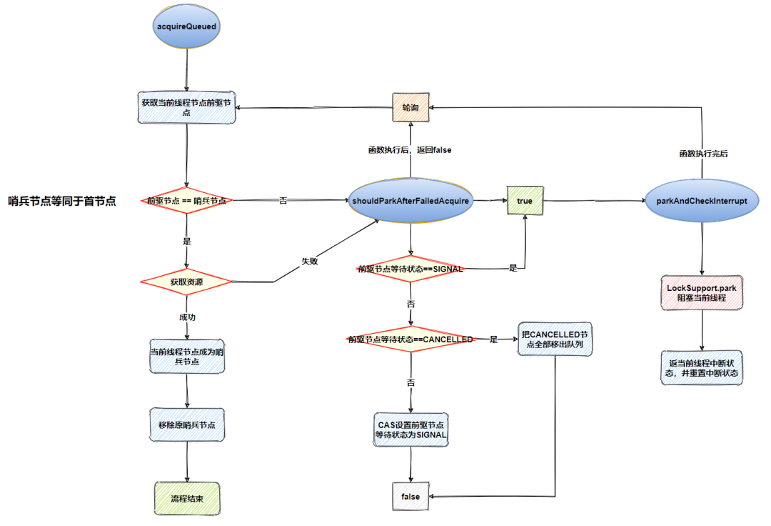 /*** @author: 程序猿阿星* @description: 自旋机制等待获取资源* @param node* @param arg* @return: boolean*/final boolean acquireQueued(final Node node, int arg) {//异常状态,默认是boolean failed = true;try {//该线程是否中断过,默认否boolean interrupted = false;for (;;) {//自旋//获取前驱节点final Node p = node.predecessor();//如果前驱节点是首节点,获取资源(子类实现)if (p == head && tryAcquire(arg)) {//获取资源成功,设置当前节点为头节点,清空当前节点的信息,把当前节点变成哨兵节点setHead(node);//原来首节点下个节点指向为nullp.next = null; // help GC//非异常状态,防止指向finally逻辑failed = false;//返回线程中断状态return interrupted;}/*** 如果前驱节点不是首节点,先执行shouldParkAfterFailedAcquire函数,shouldParkAfterFailedAcquire做了三件事* 1.如果前驱节点的等待状态是SIGNAL,返回true,执行parkAndCheckInterrupt函数,返回false* 2.如果前驱节点的等大状态是CANCELLED,把CANCELLED节点全部移出队列(条件节点)* 3.以上两者都不符合,更新前驱节点的等待状态为SIGNAL,返回false** 使用LockSupport类的静态方法park挂起当前线程,直到被唤醒* 唤醒后检查当前线程是否被中断,返回该线程中断状态并重置中断状态*/if (shouldParkAfterFailedAcquire(p, node) && parkAndCheckInterrupt()) {//该线程被中断过interrupted = true;}} finally {// 尝试获取资源失败并执行异常,取消请求,将当前节点从队列中移除if (failed) {cancelAcquire(node);}}}