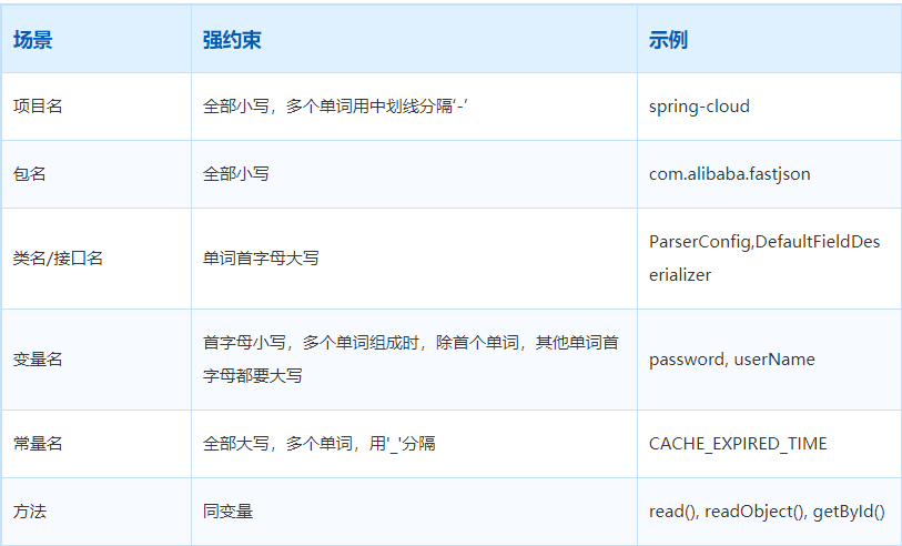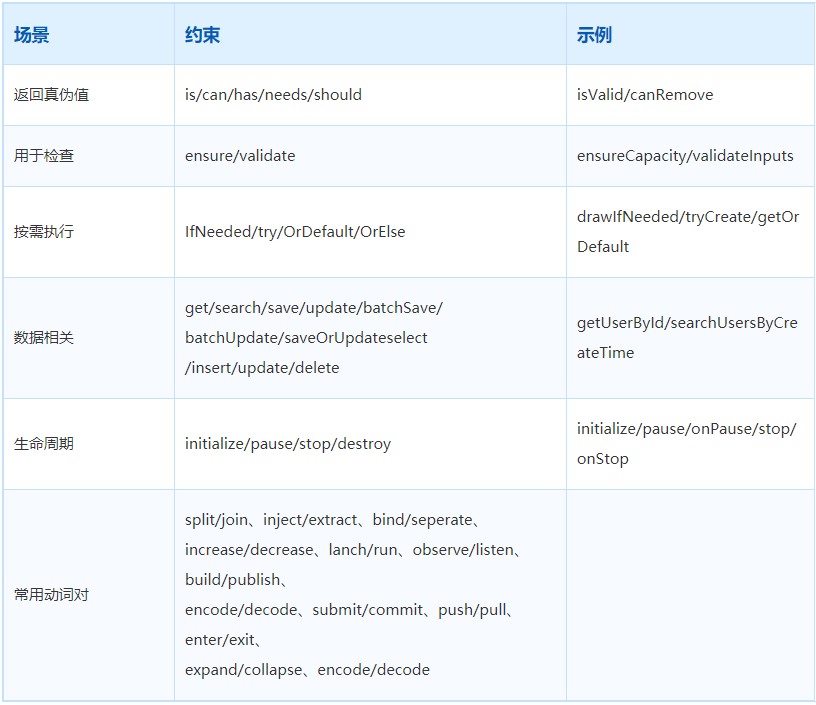 方法命名采用小驼峰的形式,首字小写,往后的每个单词首字母都要大写。和类名不同的是,方法命名一般为动词或动词短语,与参数或参数名共同组成动宾短语,即动词 + 名词。一个好的函数名一般能通过名字直接获知该函数实现什么样的功能。
