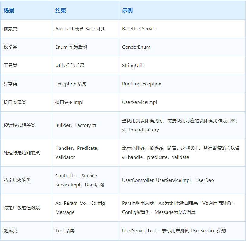 类名使用大驼峰命名形式,类命通常使用名词或名词短语。接口名除了用名词和名词短语以外,还可以使用形容词或形容词短语,如 Cloneable,Callable 等,表示实现该接口的类有某种功能或能力。