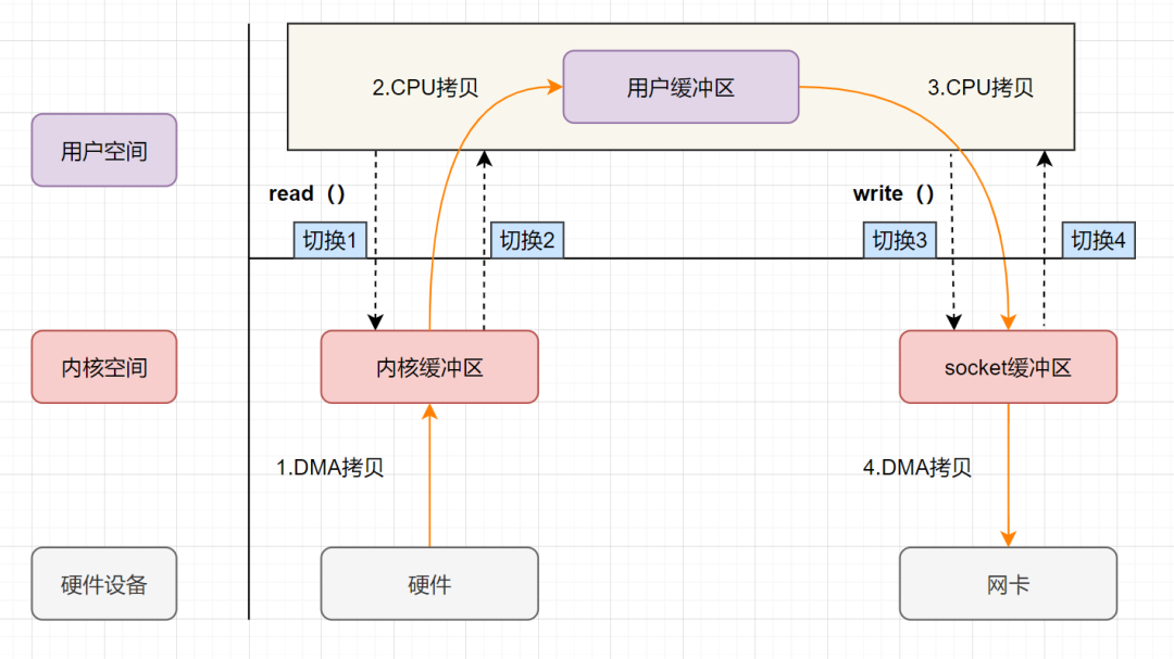从流程图可以看出,传统 IO 的读写流程,包括了 4 次上下文切换(4 次用户态和内核态的切换),4 次数据拷贝(两次 CPU 拷贝以及两次的 DMA 拷贝)。