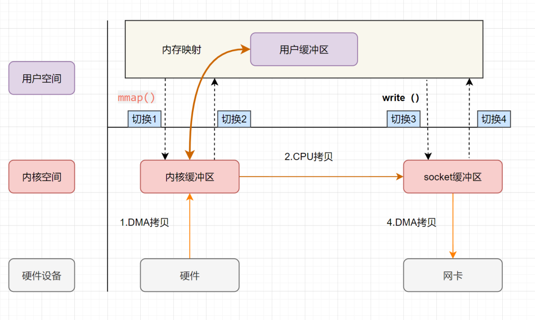 可以发现,mmap+write 实现的零拷贝,I/O 发生了 4 次用户空间与内核空间的上下文切换,以及 3 次数据拷贝。其中3次数据拷贝中,包括了 2 次 DMA 拷贝和 1 次 CPU 拷贝。