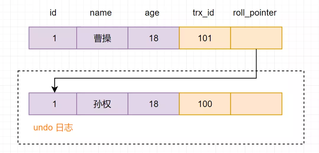 由此可得,trx_id=100 的这个记录,当前事务是可见的。所以查到是 name 为孙权的记录。