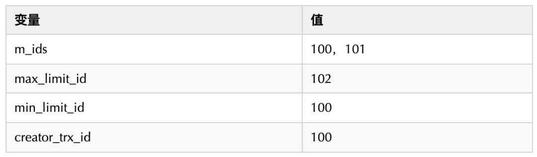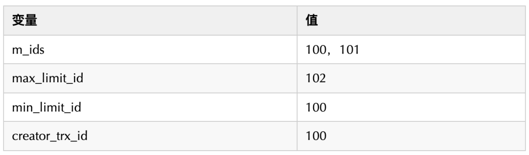 min_limit_id(100)=<trx_id(100)<102;creator_trx_id = trx_id =100;