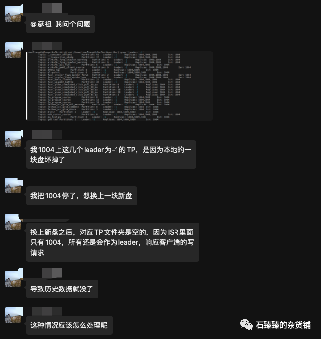 回到我们这个问题。当新的 Leader 选举出来之后,启动了定时任务之后,就会发现之前在 ISR 列表内的 1004,已经慢慢脱离 ISR。