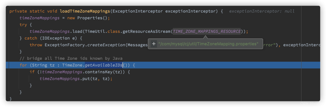 /*** Returns the 'official' Java timezone name for the given timezone** @param timezoneStr* the 'common' timezone name* @param exceptionInterceptor* exception interceptor** @return the Java timezone name for the given timezone*/public static String getCanonicalTimezone(String timezoneStr, ExceptionInterceptor exceptionInterceptor) {if (timezoneStr == null) {return null;}timezoneStr = timezoneStr.trim();// handle '+/-hh:mm' form ...//顾名思义if (timezoneStr.length() > 2) {if ((timezoneStr.charAt(0) == '+' || timezoneStr.charAt(0) == '-') && Character.isDigit(timezoneStr.charAt(1))) {return "GMT" + timezoneStr;}}synchronized(TimeUtil.class) {if (timeZoneMappings == null) {loadTimeZoneMappings(exceptionInterceptor);}}String canonicalTz;//时区缓存去找关键字if ((canonicalTz = timeZoneMappings.getProperty(timezoneStr)) != null) {return canonicalTz;}throw ExceptionFactory.createException(InvalidConnectionAttributeException.class,Messages.getString("TimeUtil.UnrecognizedTimezoneId", new Object[] {timezoneStr}), exceptionInterceptor);}