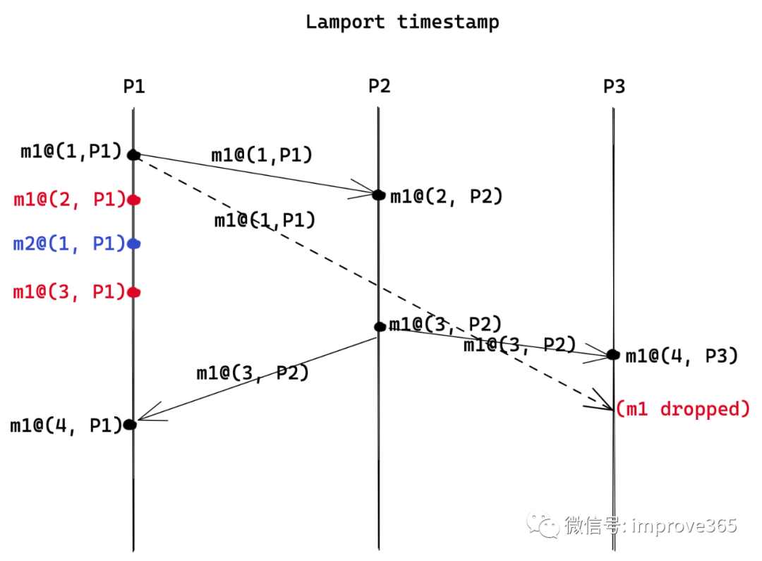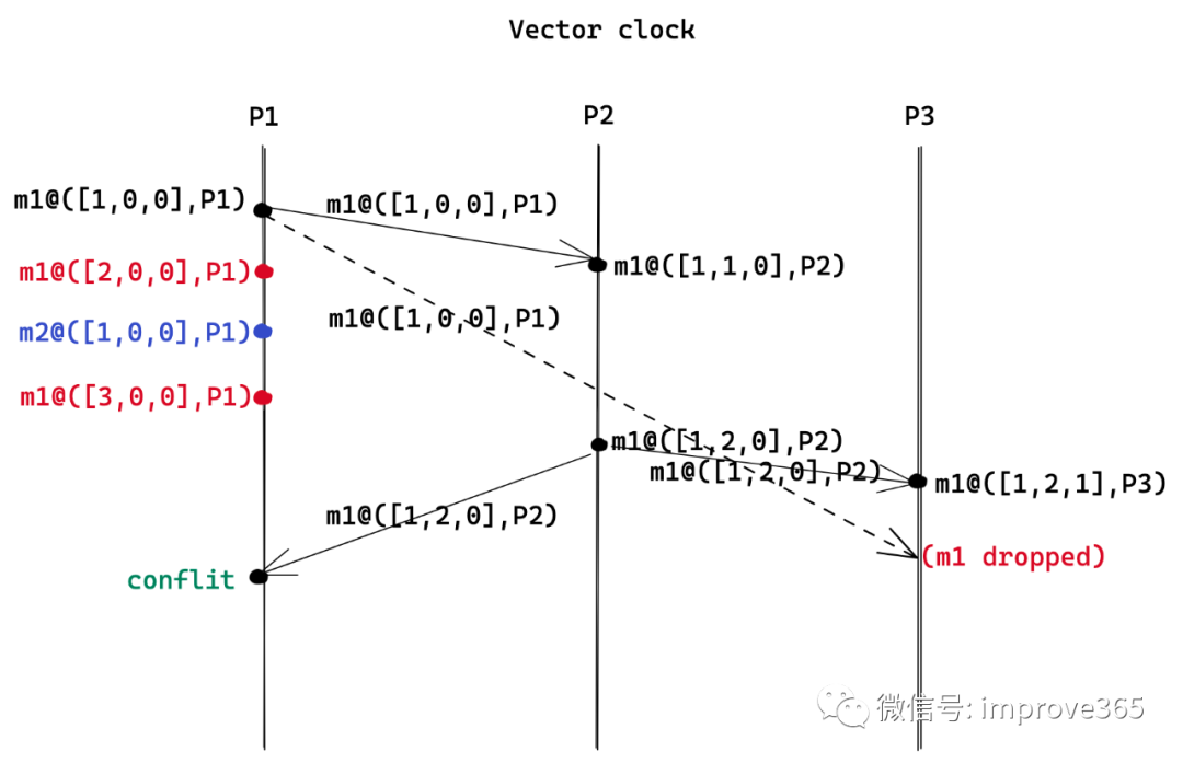P2 先接收到了此事件,本地更新逻辑时间戳,这个事件在 P2 中为 m1@(2,P2)。之后 P2 更新了 m1,本地变为 m1@(3,P2),并将此事件传播给 P1 和 P3;
