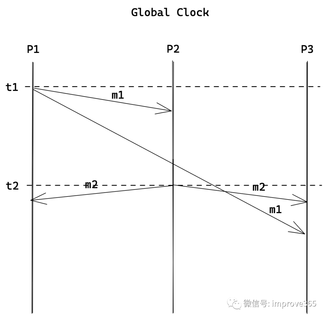 如上图,当进程 P2 收到 P1 发来的消息 m1 后,经过处理之后 P2 将 m2 发送给 P1 和 P3。因为全局时钟的存在,t1 < t2,所以在 P3 进程的视角看,肯定是先收到一个 P1 发来的 m1,然后再收到一个 P2 发来的 m2。实际上,我们程序的逻辑也是 P2 收到 m1 后经过处理才生成 m2,于因果关系上,先有 m1,然后才有 m2。不可能出现 P3 先收到 m2,然后再收到 m1 的情况。